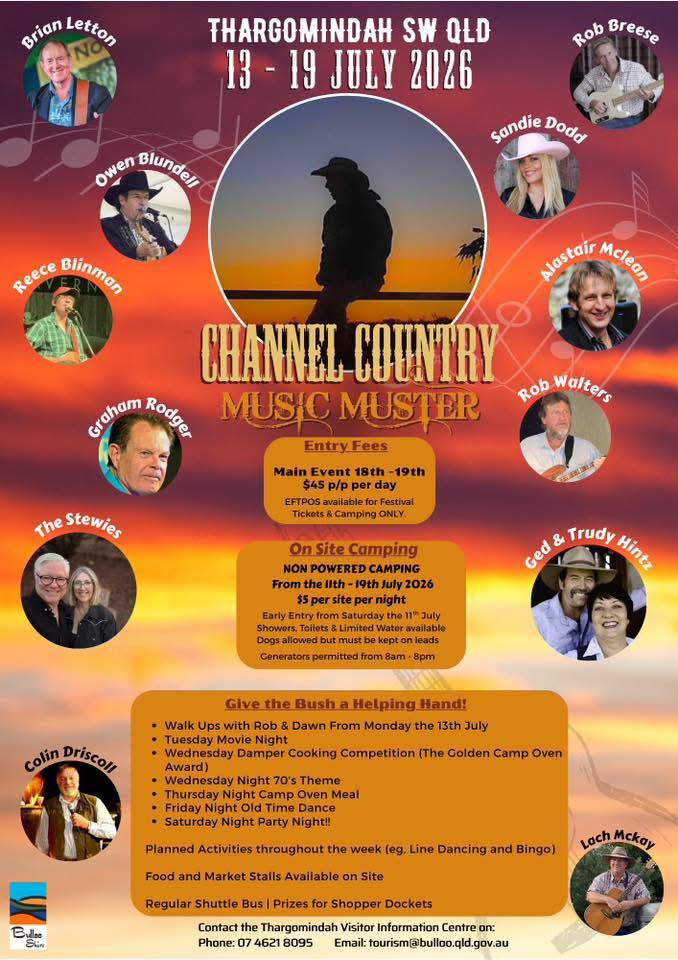 Longreach RSL Club 34 Duck St, Longreach Qld Concert 6:30 – 9:30pm Bistro open from 5pm |