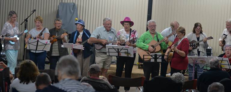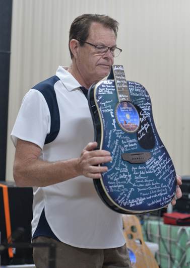 The Ukulele Band in their final performance for the tour. The picture on the right has Graham receiving a souvenir of the tour in the form of a guitar face having been signed by all the tag-alongers |
