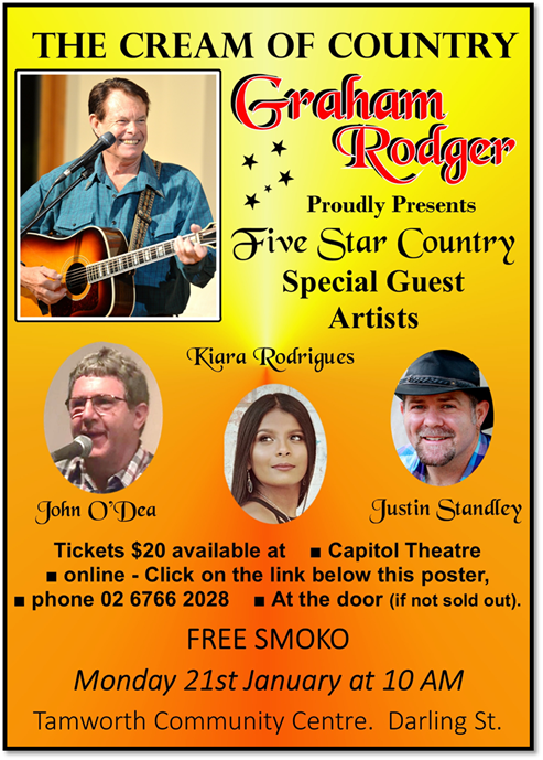 The Cream of Country, what a brilliant name for this show! It was packed beyond ‘filled to the brim’ as far as Australian country music was concerned. Graham had performed with John O’Dea on many previous occasions, but it was the first time he shared the billing with Justin Standley and Kiara Rodrigues. In putting this show together Graham demonstrated his exceptional entrepreneurial skills, producing one of the best shows available in Tamworth in 2019.